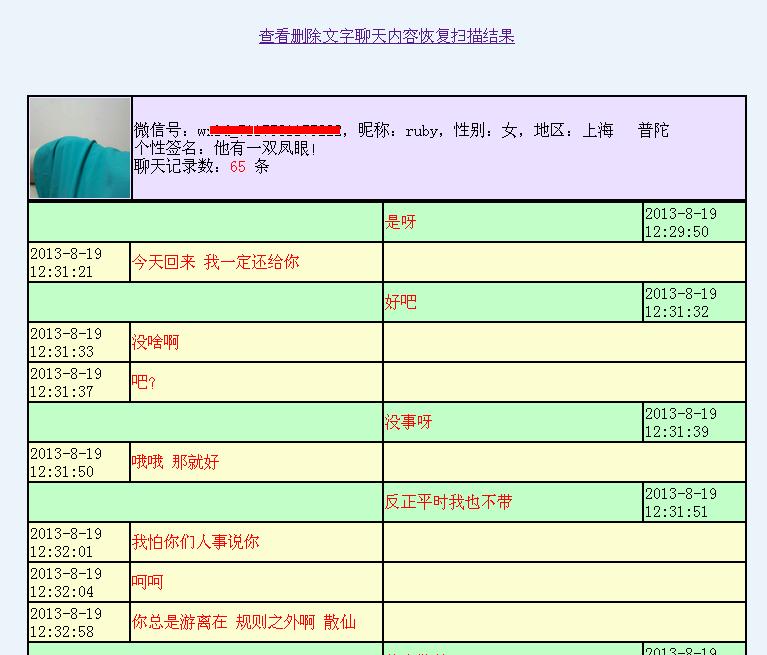 4.可以尝试恢复已经删除的文字聊天内容(只扫描恢复了文字内容,让结果的价值更高,恢复出来一堆乱七八糟的东西没意义),免费扫描并提供出对比结果,即先扫描后付款(不是所有聊天记录都能恢复,大致恢复原理与硬盘删除文件恢复类似,扫描整个数据库文件从中匹配出内容条数并处理后得到,通过内测得到的结果也没有任何规律,从20% - 90%不等,要看删除的时间和使用频率了。如果扫描不出来,说明记录已经损坏或者被新记录覆盖等因素彻底无法恢复了)